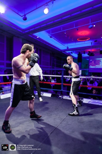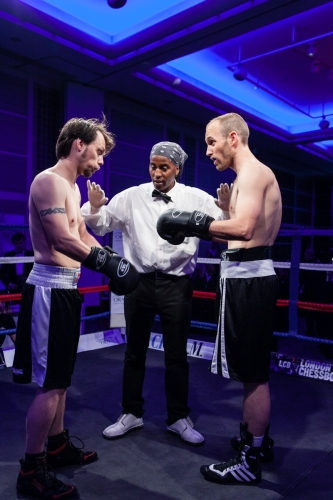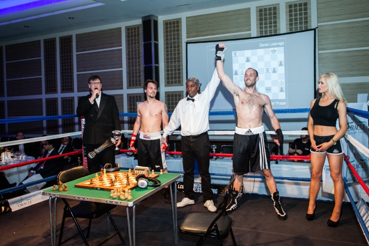 Starting on the board, Lizarraga quickly built up a small time advantage as Frazer was making his moves carefully. With the gloves on, Frazer pushed forward as he was chasing the Spaniard around the ring with jabs. In the chess, Frazer was getting the wrong end of the stick and tried to balance it out in the boxing. Using his movement to his advantage Lizarraga dodged many hits and was countering with right hands. Frazer was getting picked apart and Lizarraga landed a right hand giving Frazer a black eye. Unsettled by the hit, Frazer lost even more material and time on the board and just before a definitive check mate, his clock ran out. |